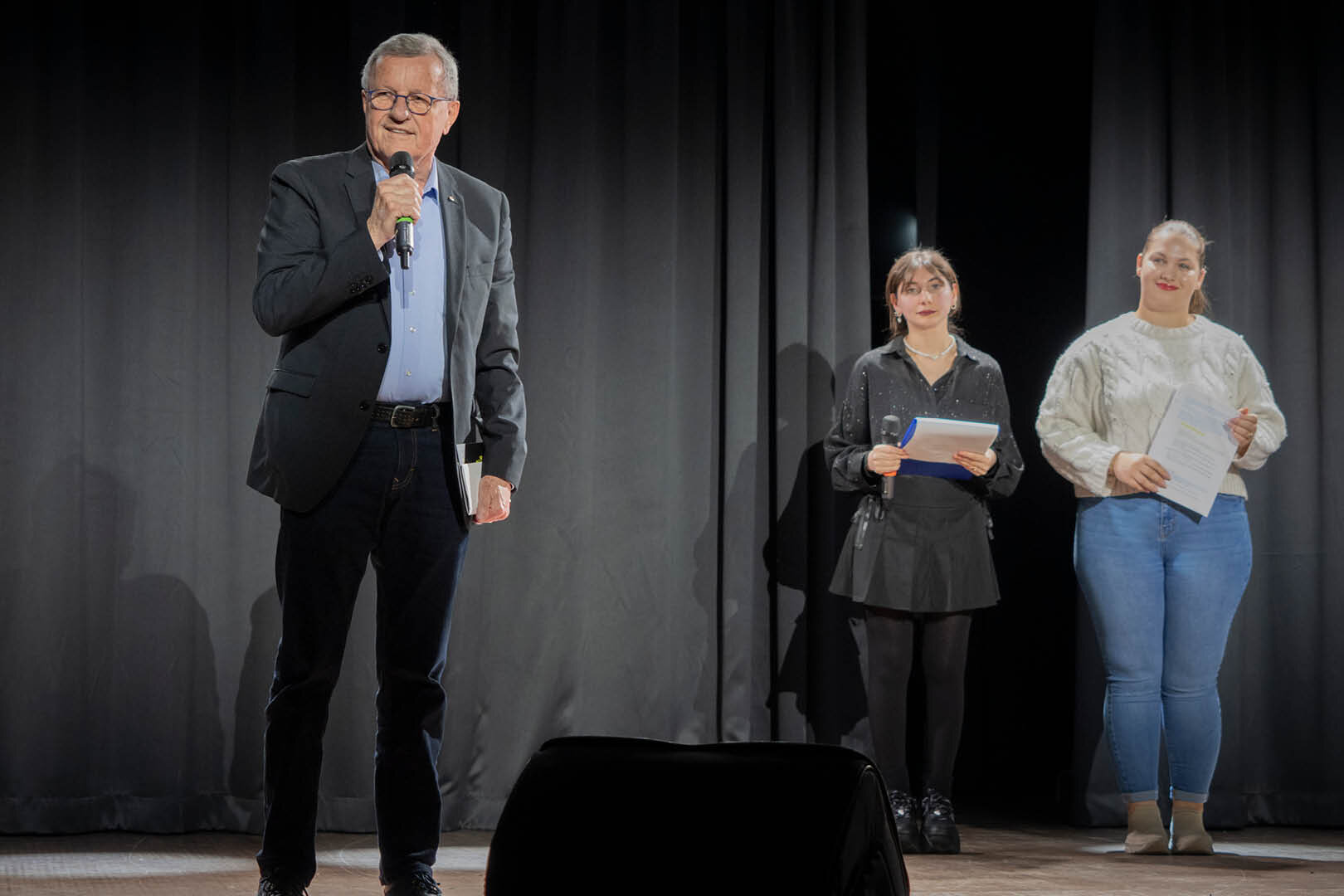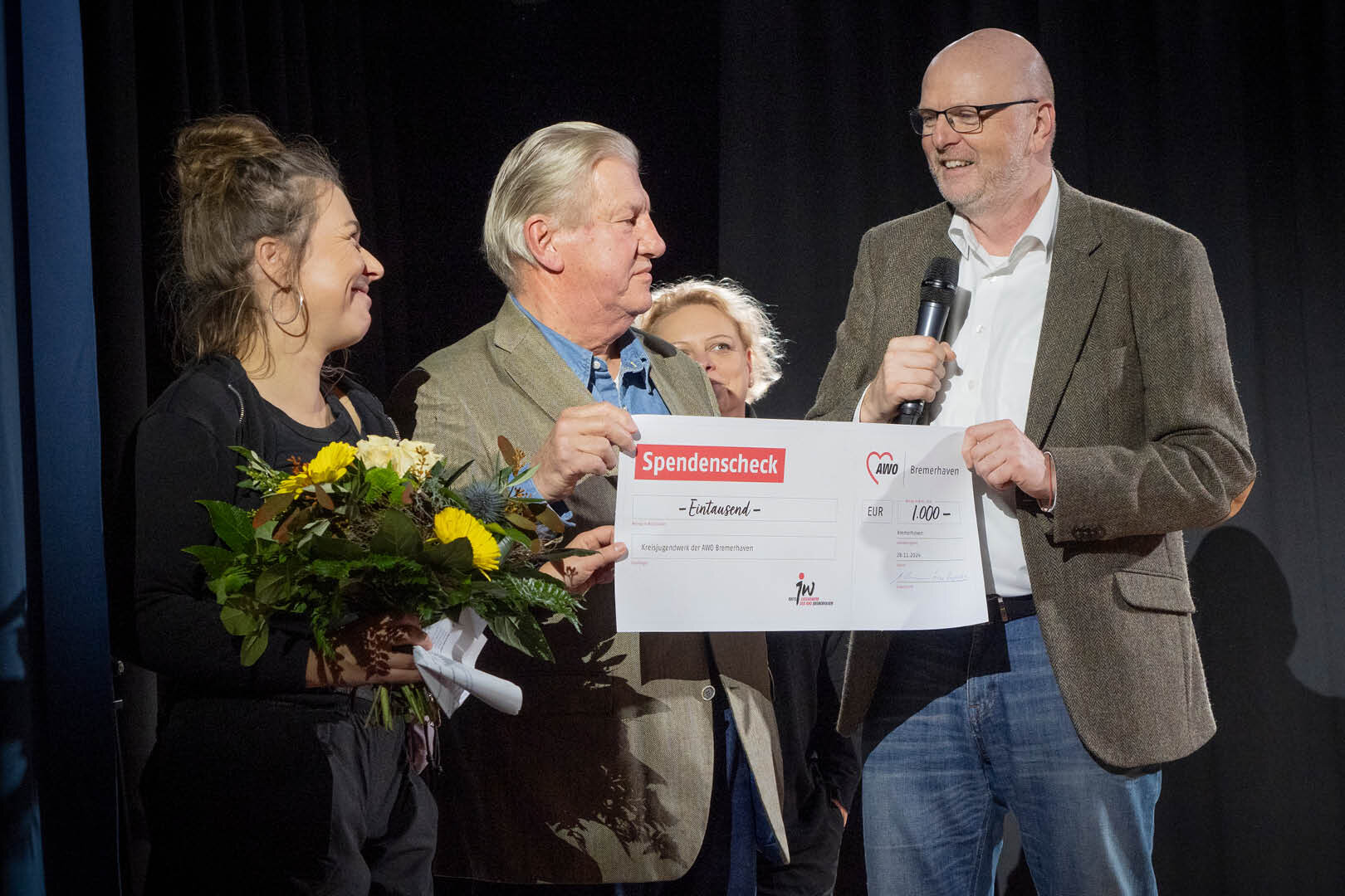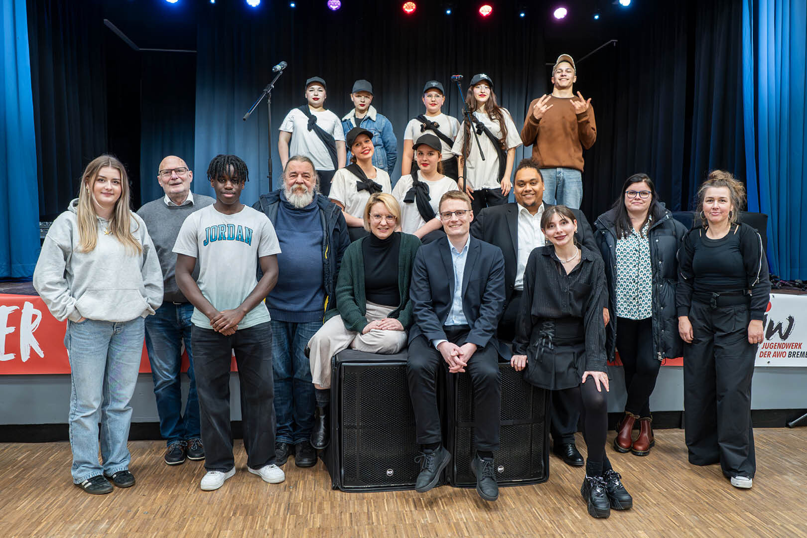 Zwischen den einzelnen Darbietungen kamen auch Erwachsene kurz zu Wort: „Wir sind sehr stolz auf Euch“, sagte AWO-Kreisverbandsvorsitzender Dr. Uwe Lissau, „weil Ihr das schafft, was wir Erwachsenen oft nicht hinbekommen: Nämlich trotz schwieriger Lebensgeschichten sowie unterschiedlicher Herkunft, Sprache und Religion respektvoll miteinander zu leben und tolle Sachen auf die Beine zu stellen.“ Zu den Gästen gehörte auch Wilhelm Schmidt, Ehrenvorsitzender des AWO Bundesverbandes: „Ich habe sehr großen Respekt vor Eurer Arbeit und Eurem Engagement.“ Für den Bremerhavener Magistrat gratulierte Sozial- und Jugend-Stadtrat Martin Günthner: „Ein herzliches Dankeschön für eure gute und wertvolle Arbeit – sie ist sehr wichtig für die soziale Stabilität für die Kinder und Jugendlichen in Bremerhaven.“ Und die Geschäftsführer*innen des AWO Kreisverbandes Eckart Kroon und Silke Rupietta überreichten einen Scheck über 1.000 Euro.