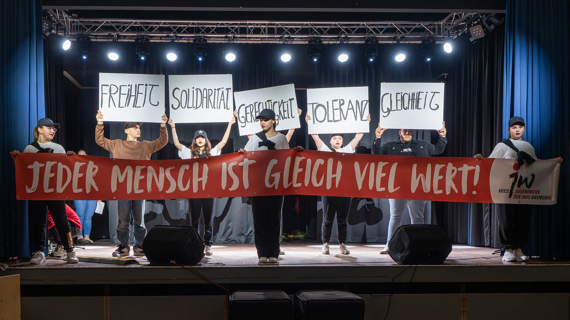 Nach einem Tanz der Jungen und Mädchen von „Rückenwind für Leher Kinder“ und einem Auftritt der Trommelgruppe (eine Kooperation mit der Schule am Ernst-Reuter-Platz) führten Ayshan Sabili und Lorena Bezdedan gekonnt durch das Programm. Und wofür das Jugendwerk steht, machte eine Performance deutlich: Schweigend schritten Jugendliche mit Plakaten durch die Besucherreihen, bevor sie sich zu einem eindrucksvollen Bühnenbild gruppierten. Die Grundwerte „Freiheit, Gleichheit, Gerechtigkeit, Solidarität und Toleranz“ standen darauf zu lesen. Und auf einem Banner: „Jeder Mensch ist gleich viel wert“.