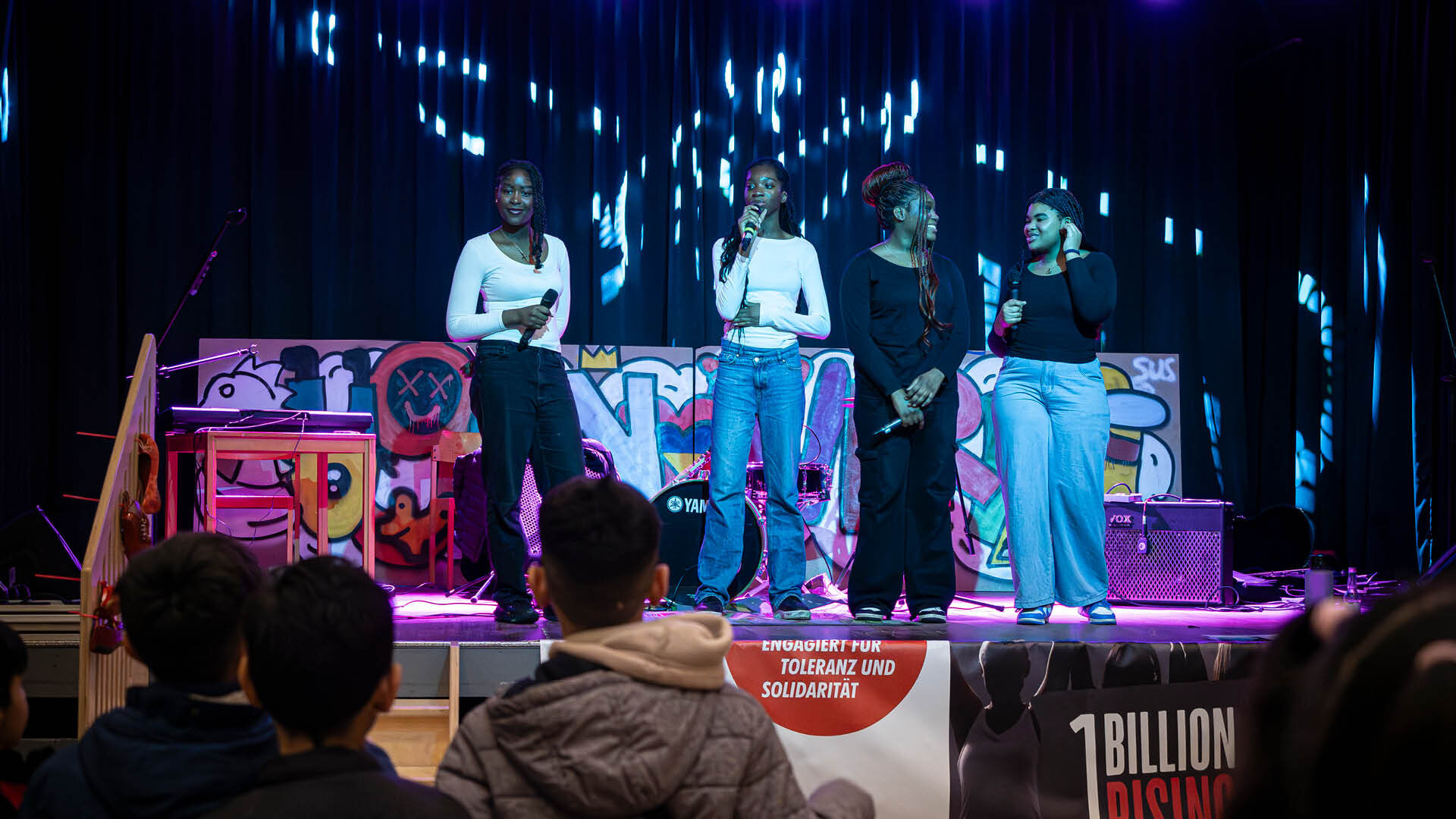 Lauten Applaus und viel Zustimmung ernteten die Akteure des AWO-Kreisjugendwerks für ihre szenischen Darstellungen von alltäglichen Rassismus-Situationen. Und dann wurde es schweißtreibend: Alle machten bei der Tanz-Choreo mit, die überall auf der Welt an diesem Tag getanzt wird – eindrucksvolle Momente voller Gemeinsamkeit und Lebensfreude, angeleitet von AWO-Jugendreferentin und Tanzpädagogin Alexandra Lüdtke. Die Bremer Mädchen-Band „Young Diamondz“ setzte den Schlusspunkt mit selbst gemachtem Soul und Hip-Hop.