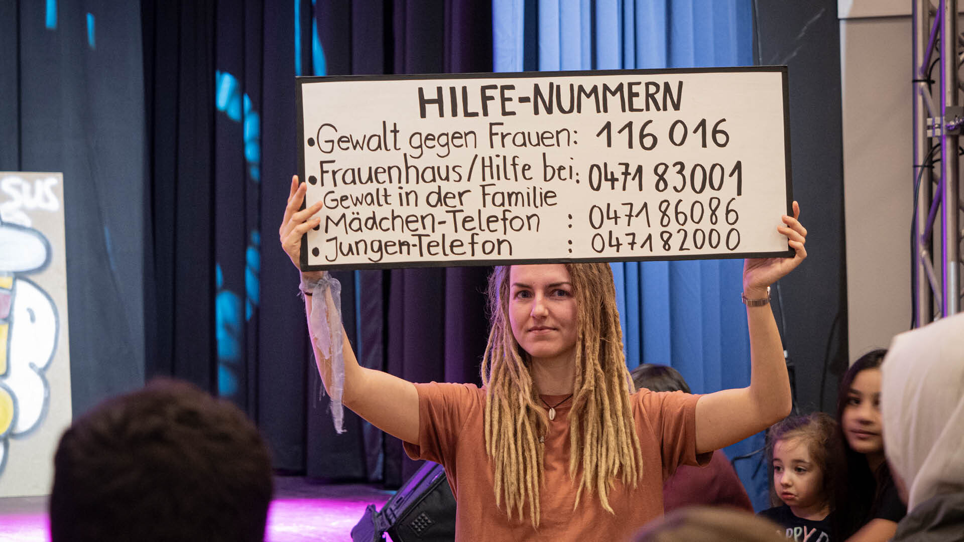 Dass die Veranstaltung wegen des schlechten Wetters kurzfristig vom Leher Pausenhof in die regengeschützten Wände des nahe gelegenen Lehe-Treffs verlegt werden musste, tat der friedlichen und dabei sehr lebendigen Stimmung keinen Abbruch. Im Gegenteil: Menschen aller Geschlechter, Altersstufen, Nationalitäten und Hautfarben waren gekommen.