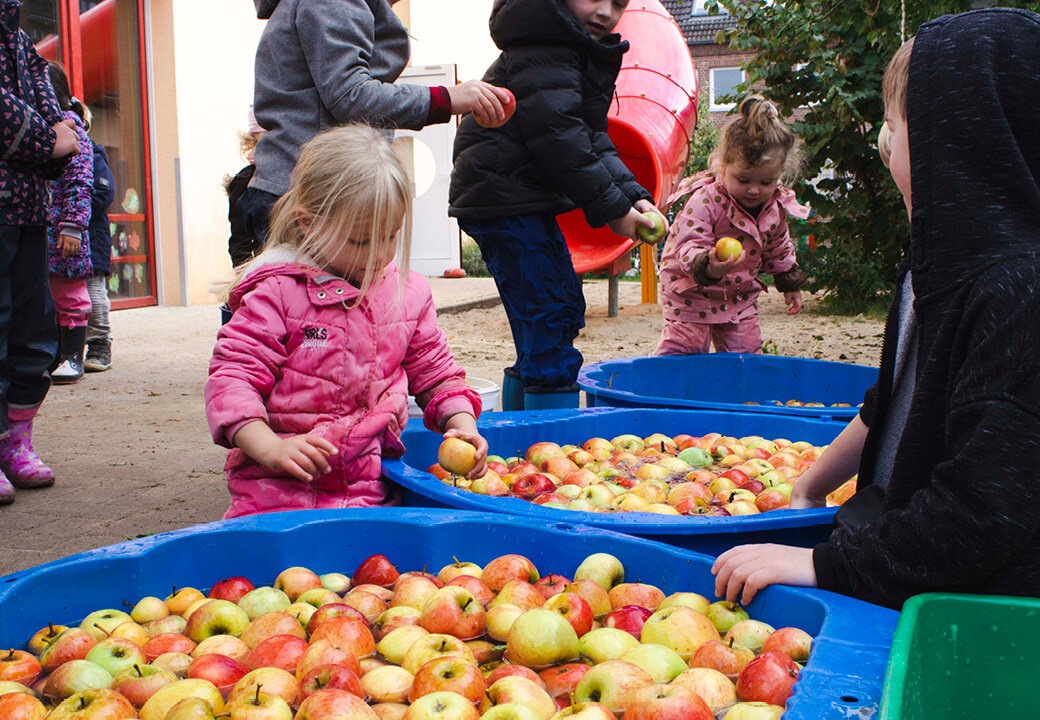 Die Idee, auf dem Gelände Apfelbäume zu pflanzen und später aus den Früchten Saft zu produzieren, waren schon bei der Planung des Außengeländes der Kita im Jahr 2009 entstanden. Bis die Bäume reiche Ernte trugen, hatte es ein paar Jahre gedauert: 2020 konnten erstmals 60 Liter Apfelsaft produziert werden.